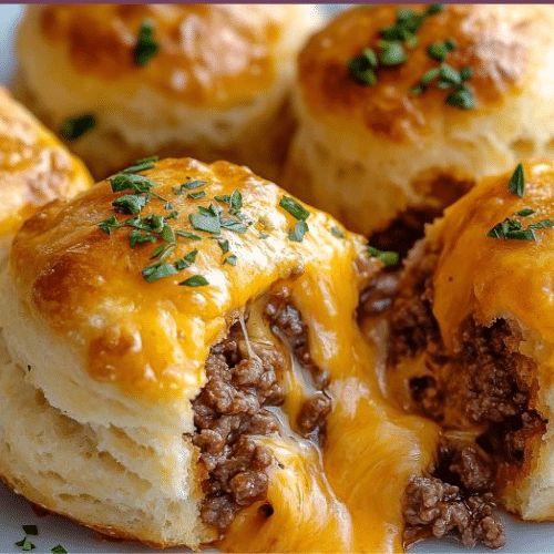 Imagine tender, flaky biscuits stuffed with savory, seasoned beef and gooey melted cheese, all baked to golden perfection. Each bite bursts with a satisfying blend of flavors—hearty, cheesy, and irresistible. Perfect for any craving!