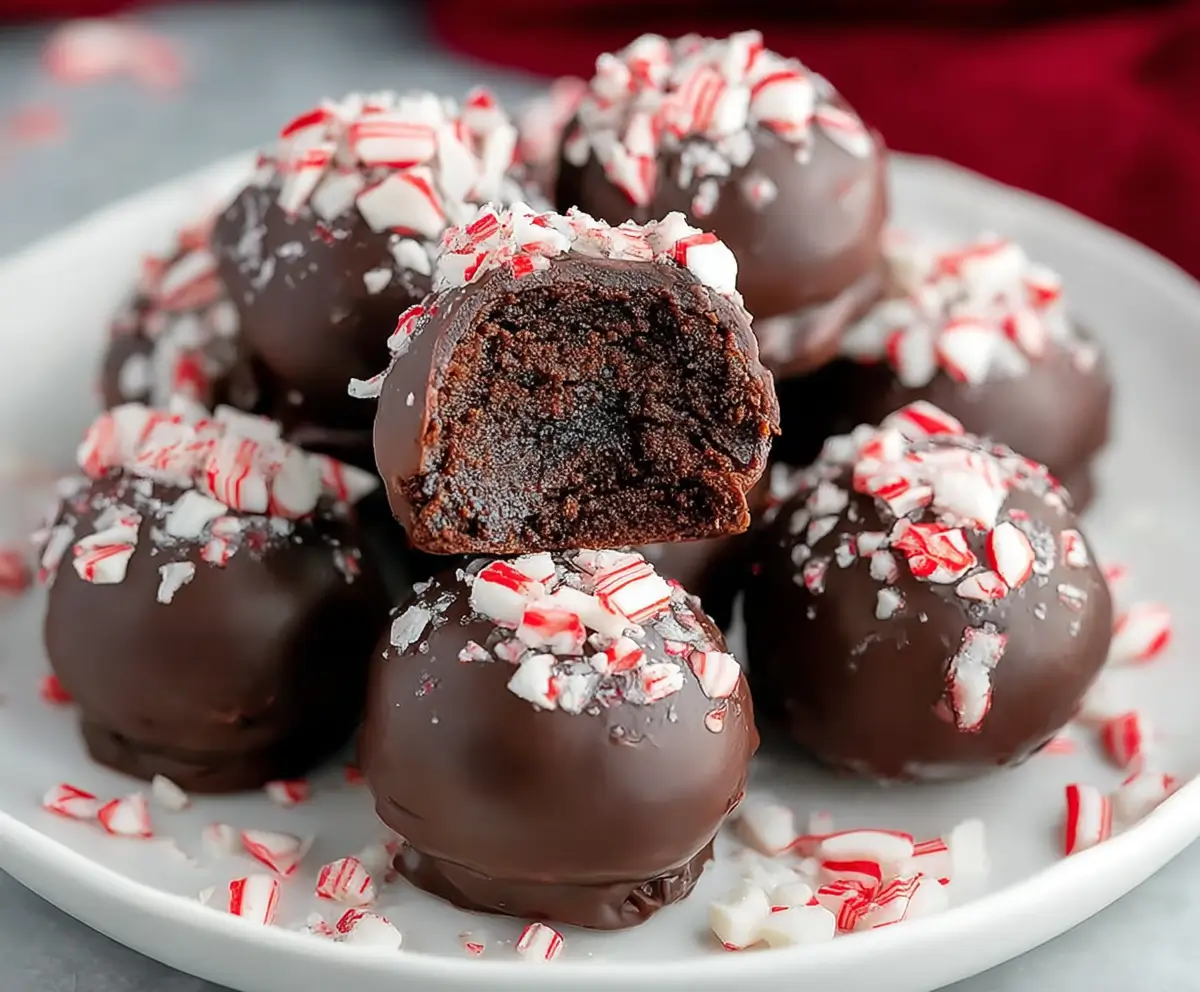 Fudge brownie balls coated in chocolate and crushed candy canes for a festive treat.