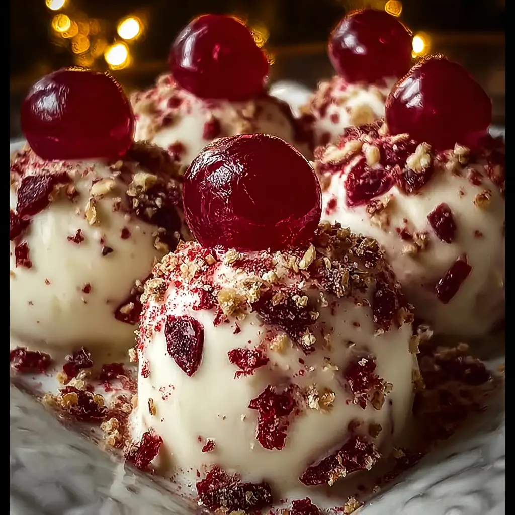 Delightful bite-sized treats made with maraschino cherries coated in a creamy mixture, dipped in white chocolate, and rolled in graham crackers and pecans.