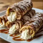 Instead of serving cinnamon rolls in their usual spiral form, this recipe reimagines them as filled, rolled pastries. Flattening and wrapping the dough allows the cream cheese filling to stay enclosed, creating a warm, gooey center that contrasts beautifully with the crisp outer layer.