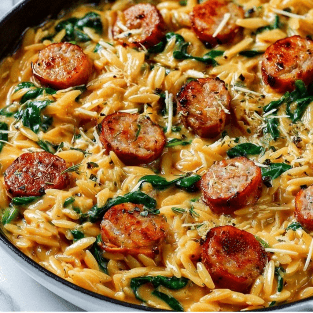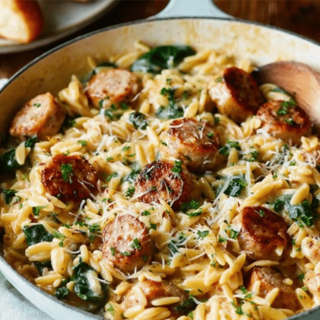 Creamy Chicken Sausage Orzo is a comforting one-pan meal made with tender orzo pasta, savory chicken sausage, sun-dried tomatoes, and a creamy, cheesy sauce brightened with lemon and herbs.
