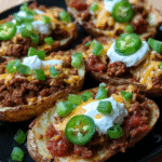 Crispy Chili Loaded Potato Skins are the perfect indulgent snack for anyone who loves hearty, flavorful bites. Golden, crunchy potato shells filled with a rich, savory chili mixture, topped with melty cheddar cheese, and finished with tangy sour cream and fresh green onions—these potato skins are a guaranteed crowd-pleaser.