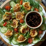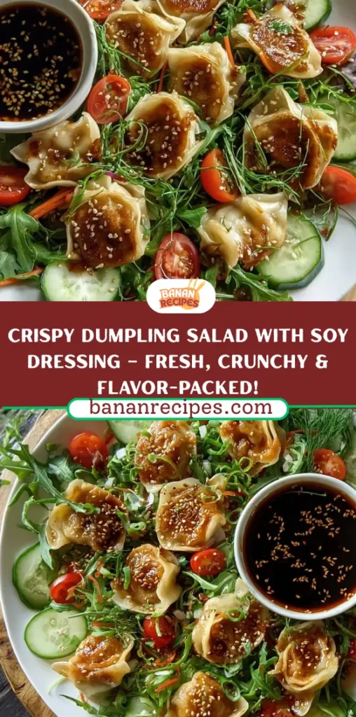 Crispy Dumpling Salad with Soy Dressing is a vibrant, flavorful dish that combines textures, tastes, and colors in one bowl. Imagine perfectly golden, crunchy dumplings nestled atop a bed of fresh arugula, juicy cherry tomatoes, and crisp cucumber slices, all coated in a savory-spicy soy dressing that brings everything together. This salad is the perfect fusion of comfort food and freshness, making it an ideal choice for lunch, dinner, or a light party dish.