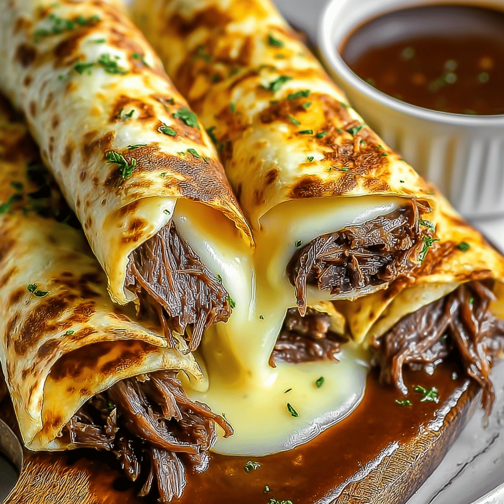 Crispy tortilla roll ups filled with roast beef, melty provolone, and crunchy fried onions, served with a warm, savory au jus dipping sauce inspired by the classic French dip sandwich.