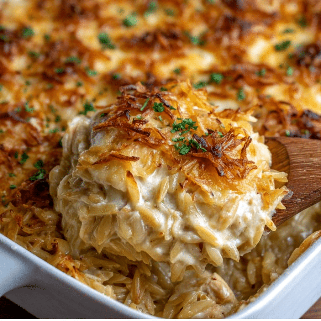 A creamy, comforting one-dish meal made with caramelized onions, tender chicken, and orzo pasta baked in a savory, cheesy sauce.