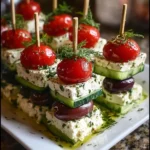 When it comes to appetizers that are light, refreshing, and visually appealing, Greek Feta & Cucumber Bite Skewers stand out as a timeless classic. Inspired by the vibrant flavors of Mediterranean cuisine, this simple yet elegant recipe combines crisp cucumber, creamy feta cheese, juicy cherry tomatoes, and briny Kalamata olives, all finished with a delicate lemon–olive oil drizzle and fresh herbs. The result is a perfectly balanced bite that feels both indulgent and wholesome.