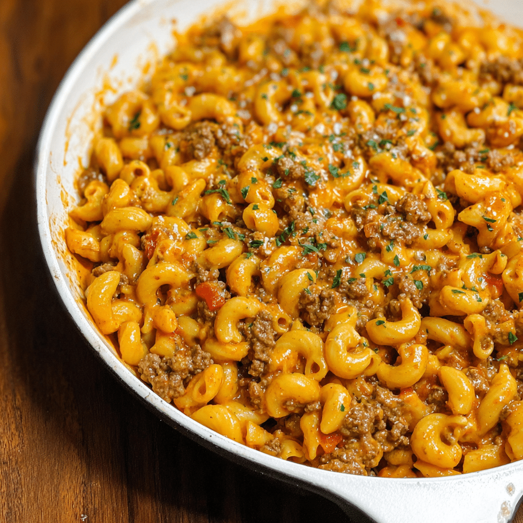 This version starts with savory browned ground beef, sweet softened onions, and a whisper of garlic. Then comes a rich, creamy, tomatoey sauce made from real beef broth, tomato sauce, and a perfect blend of Italian seasoning, smoked paprika, and garlic powder. Small pasta shells cook right in the sauce, absorbing all that flavor as they tenderize. And the finish? A generous shower of sharp cheddar cheese and a swirl of heavy cream that turns the whole thing into a silky, cheesy, irresistible one-pan meal.