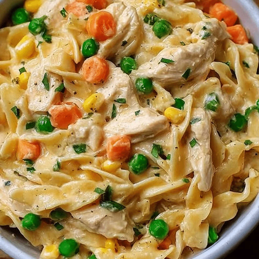 This dish is designed for busy home cooks who want something hearty and homemade without spending hours in the kitchen. By combining tender chunks of seasoned chicken, colorful vegetables, and a creamy, savory sauce tossed with egg noodles, this recipe recreates the comforting essence of pot pie filling while skipping the time-consuming crust. The result is a meal that feels indulgent yet practical—perfect for weeknight dinners, family meals, or cozy evenings.