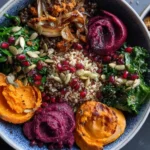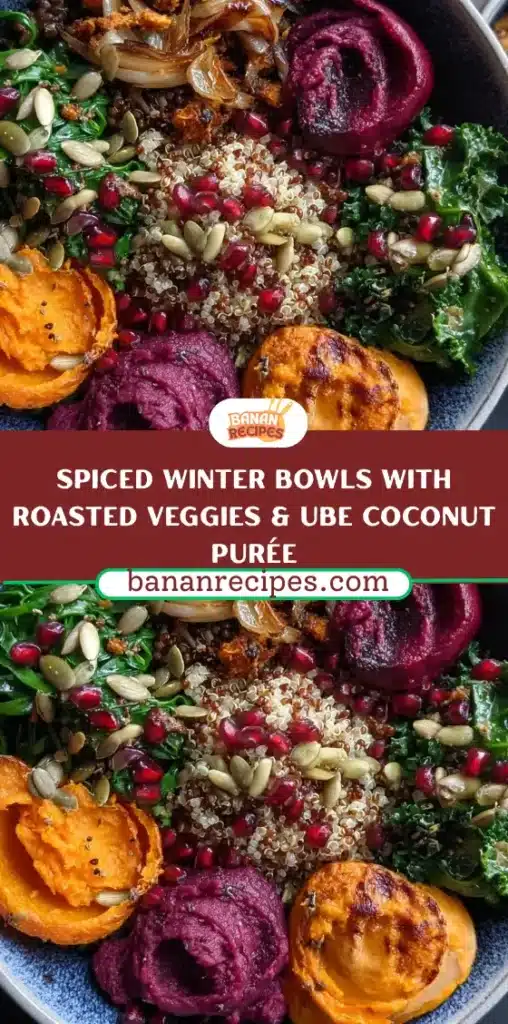 This recipe is not only visually stunning but also nutritionally balanced, making it perfect for both weeknight dinners and special winter gatherings. It combines roasted butternut squash and sweet potatoes with a fluffy grain base, a velvety ube-coconut purée, fresh greens, tart pomegranate seeds, and a crunchy pistachio-maple topping. Each component brings a unique element of flavor and texture, resulting in a bowl that feels as luxurious as it is nourishing.