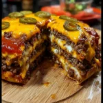 This recipe is not just a pizza—it’s an experience. It takes the familiar flavors of a juicy cheeseburger—savory ground beef, tangy ketchup and mustard, onions, pickles, and melted cheese—and layers them into a multi-level pizza masterpiece. Add a cheese-stuffed crust brushed with garlic butter, and you have a dish that is indulgent, comforting, and unforgettable.